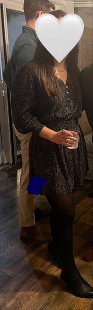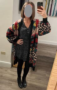 For a cold weather Friday night party, wore it with an oversized multi-color cardigan and tights/boots, but would be great in daytime or warm weather with bare legs and boots, sneakers, or sandals. Flattering at the waist! Very short on my 5' 3" frame, so I'd keep that in mind if you're over 5' 5" or taller.