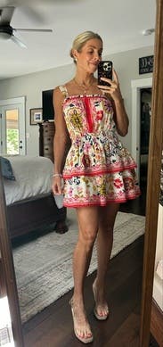 This was a fun sundress to just throw on and pair with flip flops. Vibrant colors and pattern and forgiving shape. What you need to know: it’s short, so if you’re tall or uncomfortable with your legs, this might not work for you. It’s also very good for ladies with a short torso - I felt like the waist (which is stretchy!) hit me perfectly but I have a very short torso. If you’re bigger in your chest or have a long torso, maybe size up. IF you size up, beware the straps may be too long. When I sat down, they did fall off my shoulders and I do have broad shoulders.