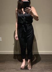 This is so glam yet somehow so every day, ample room for the girls and curves. Highlights an hourglass waist and is downright comfortable. I would've bought it if they weren't trying to charge me $400 for a used garment! I'm 32DD, 25 waist, 36 hips- 5'4- 115lbs. Insanely pretty jumpsuit. People who gave it so so reviews need to learn how to accessorize.