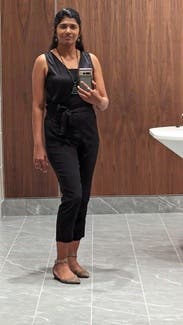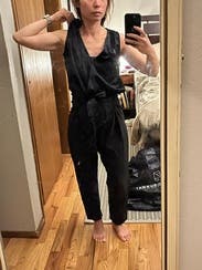 This jumpsuit was great and very flattering, but it has ZERO stretch. It was almost too tight across my hips.