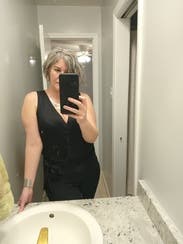 This is difficult to get in and out of. I would’ve chosen to go up a size. I dressed it up a bit with a sleeveless blazer on top.