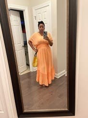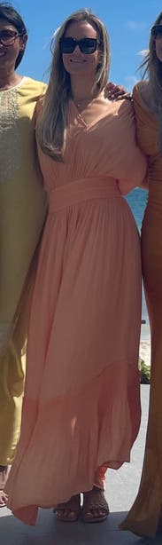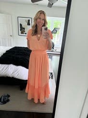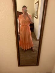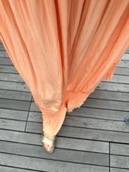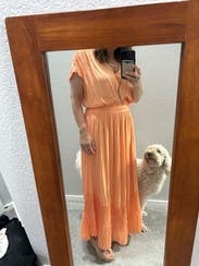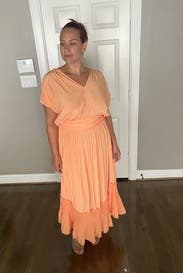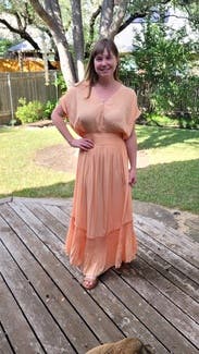 Flowy sherbet dream dress! Details are so pretty, especially the bottom layer. Top was loose so perfect for larger busts. I wore in 85F weather and felt cool. Wore with spanx to give myself more of a waist. Try this peach dream! 🍑