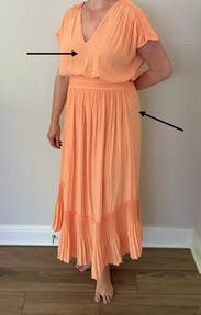 I was so excited to try on this dress and then was so disappointed when I got it on. The fabric color and texture were lovely but the fabric is VERY transparent. The skirt has a VERY short lining but even the lined area left nothing to the imagination. A slip may have helped but unfortunately the fit was not for me. The bunched fabric on the front of the dress does not wrap to the back of the dress (bottom arrow in image), and instead was one layer with a narrower shape which also made the back more see-through. This unique design would definitely be sexy on certain shapes, but revealed areas on me that I prefer to camouflage with flowing fabrics. Also the top is not lined and the detail on my nude bralette was visible, which detracted from the dress (top roe in image). This dress will be cute on a lot of people. It just wasn't for me.