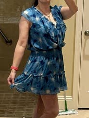 Loved the fabric and style. The v neck was a tad low cut for me & even at 5’ tall it’s a short dress. Very girlie!