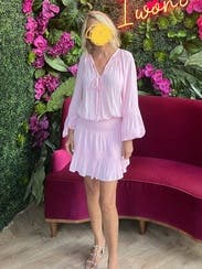 Super cute pink dress - not very tight just around the stomach and more loose on top and bottom. Great if you are tall otherwise will look frumpy. Perfect for a girls night out or date!
