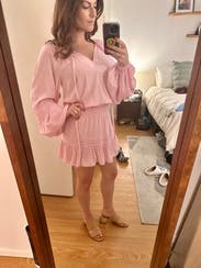 This dress fit well in the bottom and was a little too loose for my liking on the top. The color is a little more mauve/muted than the photo shows as well. Overall was an easy dress to throw on and go!