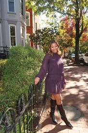 This is the perfect fall dress to dress up or even dress down with sneakers. Super flattering. Amazed at the shape of this dress and what it does for your figure. It hugs you in all the right places, cinched in at the waist but loose where you it to be for comfort! I wore a black bra underneath in this photo and it was not see through at all. Thinking about purchasing!