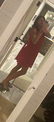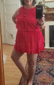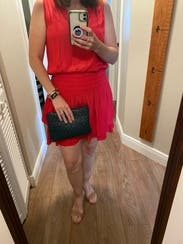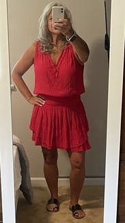 Great pop of deep coral/cherry red! Cool, comfy and easy! Not too short! Wore it twice! Once with sandals and once with cowboy boots!
