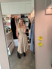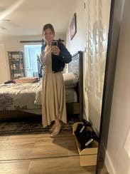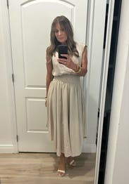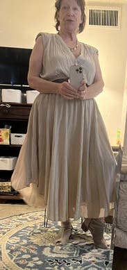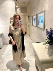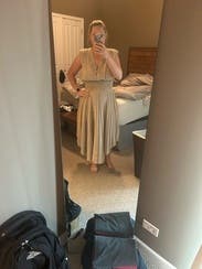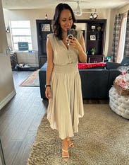 I wore this dress to an evening museum event, and everybody loved it. I got lots of compliments on how pretty and flowy the dress was. The color is so neutral and this style is easy to wear. I was very tempted to buy it. I probably could’ve gotten away with wearing the small as the medium was a little big on top and I so wore a matching cami underneath.