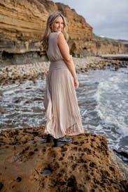 Easy to pair with different fabrics, scarves, or shawls. Great material, light, and a beautiful lay. Top could have more structure (quite a bit extra fabric if you don't have a chest). Solid piece and would rent again.