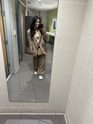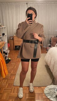 I loved the shape and thick fabric of this blazer, but it is just too large to even be considered an ‘oversized fit’. I am a true size small, and it swallowed me. I tried belting it, as seen in this photo, but there’s still too much fabric.