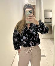 Very cute and comfortable blouse. Love the details - it has a nice print (not too busy), buttons, tassels, and cuffed balloon sleeves. It got a peasant blouse vibe. The hemline is curved and quite short, so it's not a blouse you could tuck in. I paired it with high rise jeans for WFH.
