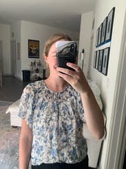 Loved this blouse! Worse it 3 times before sending it back. The print is so pretty and a comfy blouse. The sleeves are loose and gooey for a flattering cut on the arms. Just loved this one! So cute with jean shorts or dressed up for work.
