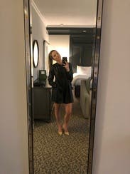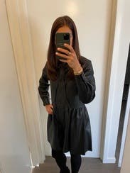 It fits loose, so I was very comfortable dining while feeling chic and warm. Wore it with fun black pantyhose's and high heels.