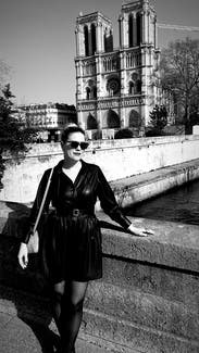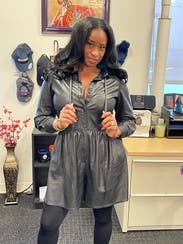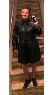 I’ve rented this a few times over the years. It’s nice once the seasons start changing because it’s long-sleeved and leathery. But it isn’t clingy and still provides some shape. Can easily pair it with tights. I wore it with long (purposely mismatched) socks and short booties.