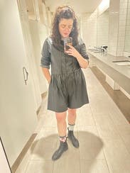 I ended up wearing this romper to my birthday dinner and a party. Rolled the sleeves and paired with thigh high boots and it was perfection. Super comfy to dance in. Fit true to size.