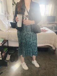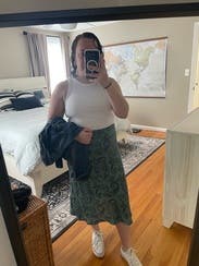 This skirt is so comfy and cute! The material is so flattering. I love that it can be dressed up or down! I ended up buying it because it’s so versatile.