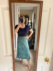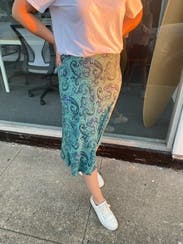 This is a pretty simple skirt. Easy wear with the elastic waist, though I did find it flipped sometimes. Pretty colors and print. I loved it styled a little preppy though and was nice for a cooler fall day in the northeast.