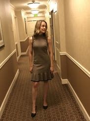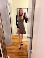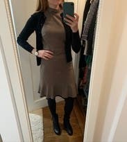 Very nice dress, have worn styled with boots and jacket and as pictured with heels. Easy one and done piece for work. Details, like the mock collar and velvet trim make it feel special. A good rental!