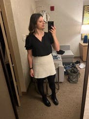 Versatile, winter white skirt that is not quite a mini. That makes it perfect for work or play. I'll keep this one for a little while, friends.