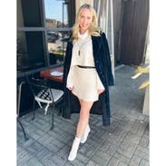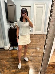 Love this. Paired it with a black top. Fit perfect. Not too short. Doesn’t ride up. Like the winter white color.