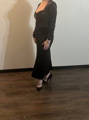 Rented as an option for a NYE wedding and decided to wear something else because the overall shape was too matronly in my opinion. However the dress is well made and full velvet which was festive.