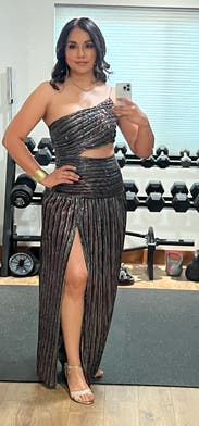 Didn’t wear this but wish I could have. It fit well, maybe a little loose around the waist so that I might’ve been readjusting a lot throughout the night. I would have tolerated that but ultimately it was way too long even with 3.5-4” heels for me (5’2”) and I was afraid of tripping over it