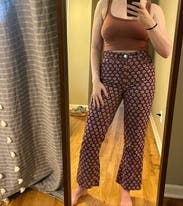 Despite the 5lbs I've recently gained, which resulted in these feeling tighter than I would have liked, I felt like a rockstar in these pants. Perfect length and flare for vintage Frye Campus boots, or cute sneakers in warmer weather, these VERY high waisted pinwale cords are super cute. Eye catching pattern will result in scads of compliments. There's an ever so slight bit of give to the fabric, so I suggest trying in your usual size. Have fun!