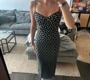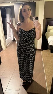 I’m a true size 4 and I sized up to a 6 based on the reviews. Overall, it was a good call to size up bc Reformation runs small. For me it ran small in the hips, but the chest fit perfectly. I imagine this looks best on individuals with small hips and no butt, which is not me, so it wasn’t as flattering as I hoped. The print is adorable and it’s very lightweight, best for summer or spring. I’m not totally sold that this brand is for me, but the designs are so lovely I’m sure I’ll try again.