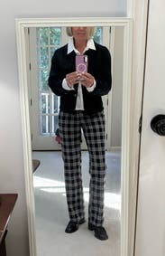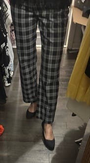 There aren’t any front pockets so it lays flat across your front which is very slimming. I’m 5’5” and I wore with flats, also could wear with heels. Classic plaid print that goes with everything. I enjoyed wearing these.