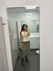 I find reformation runs smolllll so I ordered the upper range of my size, but it ended up large. That said, easy staple piece that was a fun twist on a green cargo pant