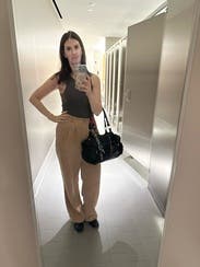 Do you like you waist high and snatched? Do you love pleats in front? Do you love that baggy vibe straight from a rom-com with the brat-pack? These pants are for you. Long, tight at the above your belly button waist yet loose through those hips. Great Carmel color