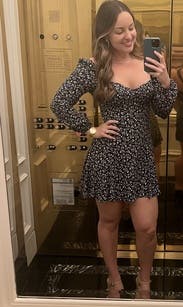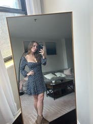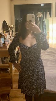 I was worried this would be too big as I am usually a size two but I ordered the size four because it was the only one in stock and it was actually perfect. I own a reformation top in a very similar bodice cut (one they do a lot!) in size two and I struggle with my boobs coming out of that top, although it looks like it fits perfectly / doesn't look like they're going to come out. For that reason, I would recommend sizing up if you have bigger boobs — or even, just not very small ones. My boobs are on the smaller side (I'm a 30E, which is a very small band size) and this made them look great, while the larger size kept them from falling out. You can't really wear this dress with a bra, though, as you will be able to see the edge of the cups. (Unless that's your vibe, which is great.) On a more fun note, this dress was so fun to wear. I found it easy to dress up or down, and it made me feel super feminine and chic. It was also super comfortable. It's also insanely flattering. Out of everything I tried this month, this is the thing I'll have the hardest time saying goodbye to. I've worn it a lot, and would definitely buy it if I could afford it!