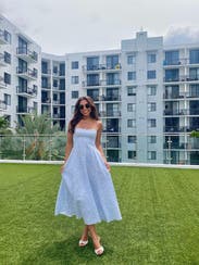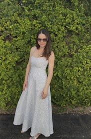 I loved everything about this dress: the tiny blue print, the quality of the fabric, and the length of it on me, more specifically. Have been in my Reformation era for a while and have been waiting for the right piece to come around, and this one was hit. Huge props to my RTR stylist to had this at the top of her list for me!! Super flattering. I'm a 28/6 in bottoms and a 10 in tops, and the 10 fit me like a glove since the back has lots of stretch, but still enough structure to cinch you in.