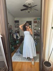 Favorite dress of the summer! Ended up buying it. Rent this. I sized down and fit great!