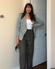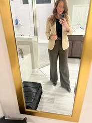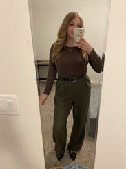 These pants were very flattering which says a lot since I feel like nothing looks right on me since having a baby. I paired them with a black belt and a beige blouse.