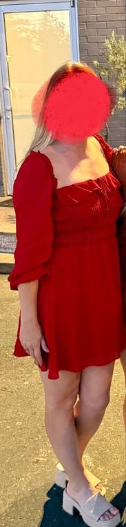 This dress is the perfect holiday red! But be mindful of sizing here. I went through reviews and thought a 2 would fit and boy was I wrong. The 2 was SO short and the sleeves were too tight. Here is the 4 that fit perfectly. Might still be too short for some but it was just what I was looking for our Christmas pictures.