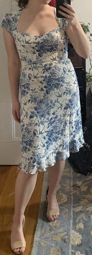 I loved this dress so much I almost bought it. It fits in all the right places, the neckline is incredibly flattering, the length sits right below the knee, and the pattern is so beautiful. For broader ribcage ladies (36 band +) it is slightly tight, but in a way that it helps your shape. I was worried about the color making me look washed out but it was totally fine—would look great on any skin tone.