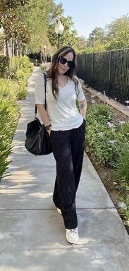 Reformation’s Tully Pant features a mid-rise waist and relaxed, wide-leg cut that floats beautifully in warm weather. Wear it with a breezy crop tee and slide‑on mules for a laid‑back yet polished summer look.