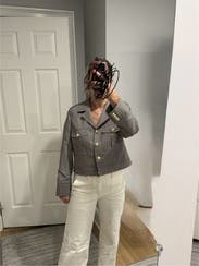 Arrived brand spanking new, was a little bulky for my taste, but still cropped and completely unlined. Couldnt quite pull it off. Definitely a very light weight option, cute tho!