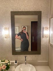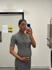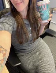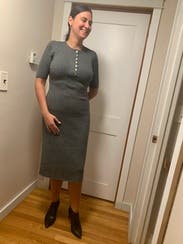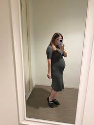 I rented this in a medium at 8+ months pregnant and it was great! A little on the plain/conservative side, with some interest added by the buttons and back seam. It’s extremely comfortable and I received compliments on it throughout the day.