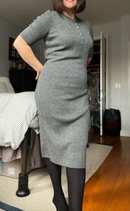 The dress is a lovely soft sweater, nice buttons and details. I found it to be a bit bigger than expected, I think I could have sized down.