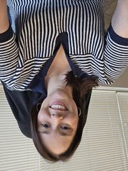 Blue striped top. (81% Linen, 19% Nylon). V-neck. Short sleeves. Pull on. 14" from shoulder to hemline. Imported.