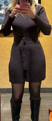 Nice color. The belt was cute. Does rise a little in the back if you have a booty. Wore with tights and ankle boots.