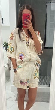 I am in love with this outfit. The fabric is light and breathable and the embellishments are incredibly fun. So many compliments on this. The shorts are true to size but I chose a medium for a more baggy look. I could have sized down very easily. Definitely not ready to let this set go anytime soon! Thankfully the Florida heat is perfect for this! Rent it. You will not be disappointed.