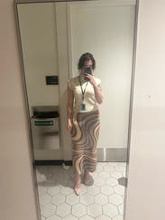 Dressed down with a white tshirt. Knit was thick but still comfortable in NYC summer heat. Super fun print and flattering cut.