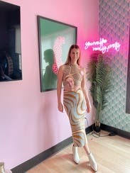 I rented this set for the Eras Tour (thought it was a perfect Midnights outfit) and it was perfect! It was a bit thicker than I expected (it’s a true knit) but it didn’t get hot at all. The top fit great except the neckline - buttoning the back felt like I was wearing a choker, so I left it undone but it wasn’t an issue. Besides that it was SO comfortable and I got compliments all night - would rent this again in a heartbeat!