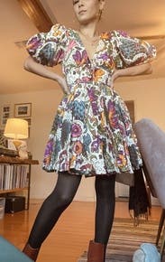 Perfect cocktail dress, received so many compliments on this! Colors are stunning and the puff sleeves are EVERYTHING. Feels short, but doesn't look it. Love this one!! Perfect sizing too!
