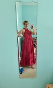 This dress was a dream. Loved the color and pattern and the bow at the neck in the back! Some reviews said that the neck was tight, but I didn't find it to be uncomfortable or tight at all. I got a medium because that's what was available, and I was concerned it would be too large since the style of the dress is so flowy and roomy. But, it was a perfect fit! Definitely would rent again!