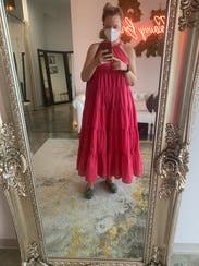 Love the cut of the top of this dress, but the collar needs a bit of starch to keep it up. Could belt it if you want to show your waist more as this dress does have a lot of material. Great for a warm night.